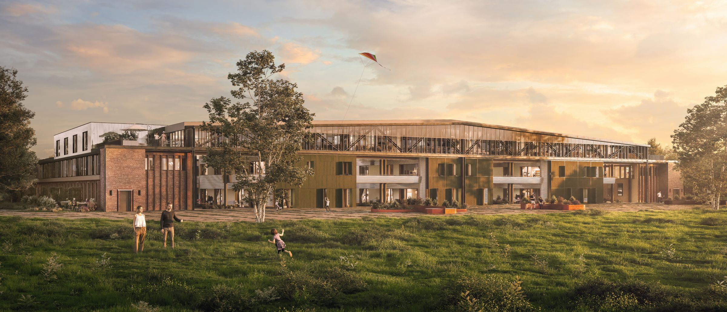 „Von der Ortsmitte Rangsdorfs führt die Walther-Rathenau-Straße durch die Bückersiedlung bis zur Stauffenbergallee. Dort öffnet sich das Flugfeld – links die Endmontagehalle. Seit 1938 prägt sie das Areal. Der ehemalige Werkstattbau, das Atelier, erinnert an einen Tempelbau und bleibt nach Sanierung erhalten. Drei Häuser entstehen in der Halle. Form und Fassaden nehmen Bezug auf die Flugzeuge, die hier einst montiert wurden.