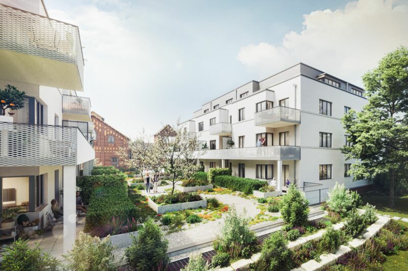Im Apparatehaus entstehen Gewerbeeinheiten zur Graf-Arco-Straße. Gewerbebetreiber sitzen so für ihre Kunden sichtbar an einer der Hauptstraßen Nauens und nah zum Bahnhof. Die Wohnungen des Apparate- und Ofenhauses sowie des Neubaus sind zur Innenhofseite ausgerichtet.