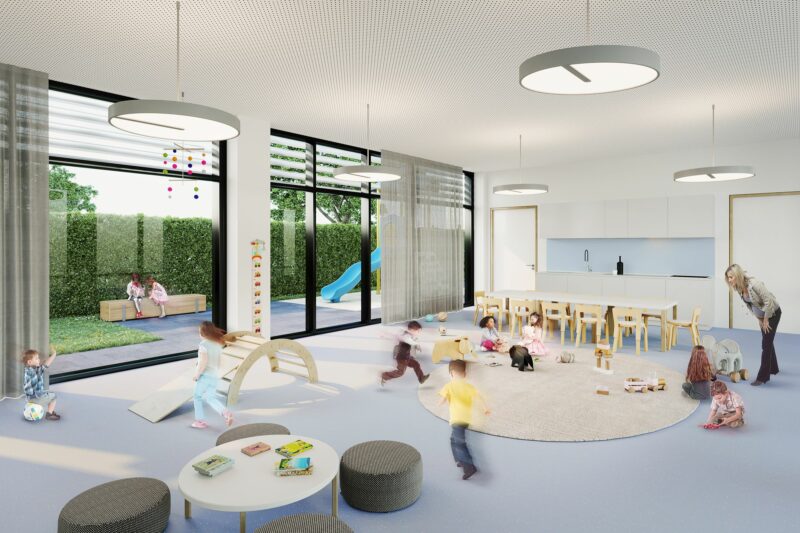 Im Erdgeschoss wird außerdem eine Kinderkrippe für 12 Kinder sowie ein Eltern-Kind-Zimmer entstehen, um der flexiblen Arbeitswelt von morgen und den steigenden Anforderungen an eine bessere Vereinbarkeit von Familie und Beruf gerecht zu werden.