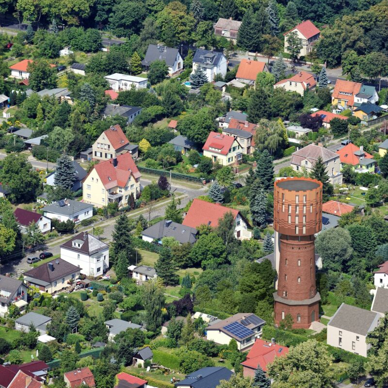 Der 39 Meter hohe Wasserturm ist Wahrzeichen für Altglienicke. Er bedeutete Fortschritt und Lebensqualität, zierte Postkarten und Briefmarke. Nach 64 Jahren Leerstand gibt es eine Zukunft für das Denkmal in der Schirnerstraße: Der Wasserturm wird saniert; zwei neue Doppelhäuser zur Straße ergänzen das Denkmal.